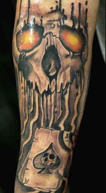 Tatuagem: O padrão de favo de mel em seu braço direito atinge a parte interna de seu antebraço direito e se junta a uma tatuagem de um grande crânio derretido. Há também um cartão tatuado abaixo do crânio. O cartão está gasto e é um ás de espadas com outra caveira tatuada dentro do desenho da espada.