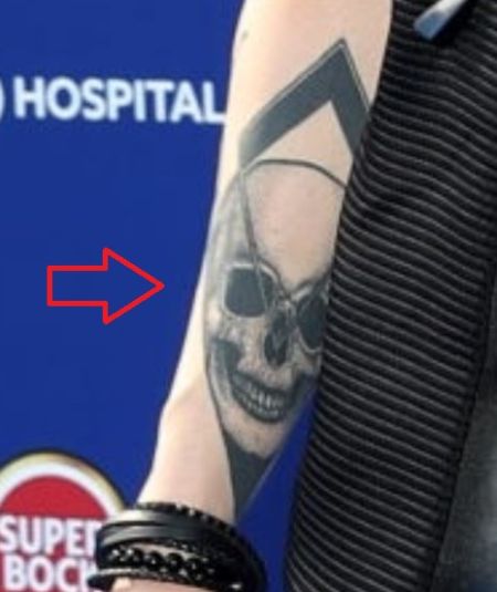 Tatuagem: Os lados superior e inferior de seu antebraço direito são cobertos por um retrato de quatro faces.