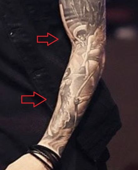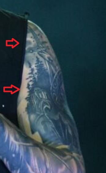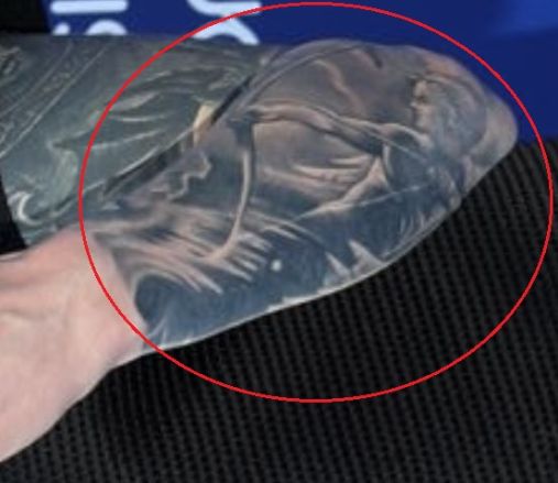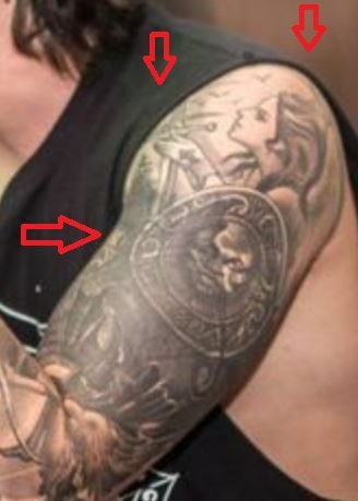 Tatuagem: O tema grego em seu braço se estende para baixo também em seu antebraço. Há uma tatuagem de Zeus, tatuada perto de seu cotovelo esquerdo com asas e um raio tatuado em seu bíceps. Há outro deus grego tatuado na parte interna de seu antebraço esquerdo. O resto da manga tem luzes e nuvens para cobrir os espaços entre outras tatuagens.