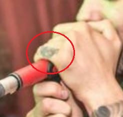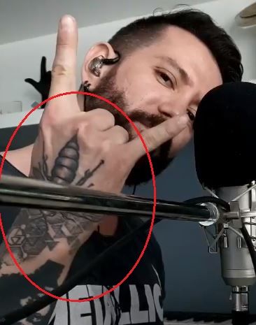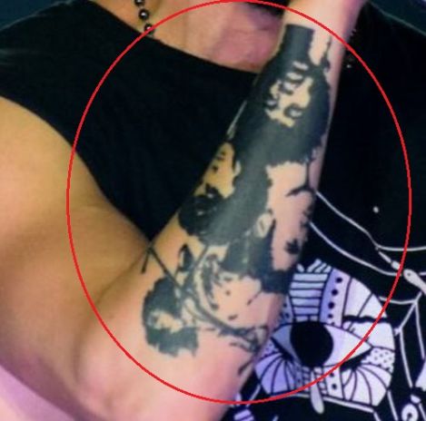 Tatuagem: O ombro esquerdo e o braço do músico são inteiramente cobertos por uma grande tatuagem. A tatuagem começa com uma mulher segurando uma espada na mão. Abaixo da mulher, há um escudo de bronze com um rosto. O resto de seu braço é feito com tatuagens de árvores altas e escuras à noite com um céu estrelado.