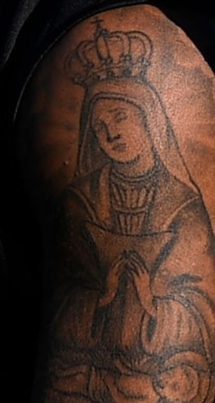 Significado: A tatuagem representa os pontos de vista religiosos de Mariano e é inspirada na história da criança divina. Menino Jesus sendo segurado em seus braços pela Virgem Maria.