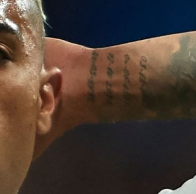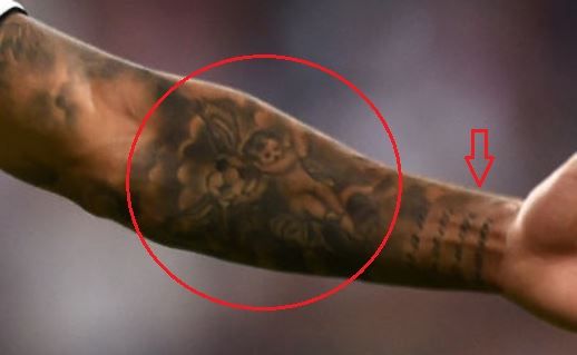 Tatuagem: A parte interna de seu antebraço esquerdo contém a tatuagem de um querubim segurando uma bola de futebol nas mãos. O futebol também tem asas. O plano de fundo do desenho da tatuagem é feito com um padrão de nuvens escuras. Também há quatro datas tatuadas na parte interna de seu pulso esquerdo.
