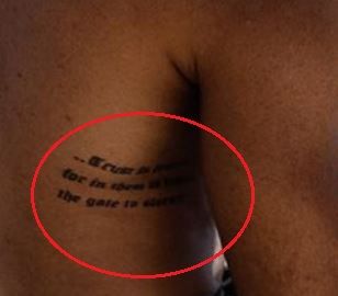 Tatuagem: O lado direito de seu corpo contém outra citação tatuada que diz: “… confie nos sonhos, pois neles está oculto o portão para a eternidade.”