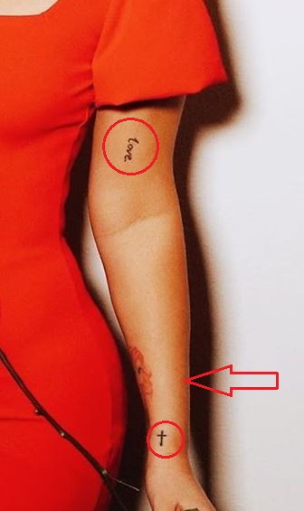 Significato: La croce rappresenta le opinioni religiose dell’attrice. Il tatuaggio della bambina sul lato interno del suo avambraccio è un tatuaggio di Ariel de La Sirenetta.