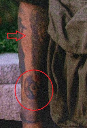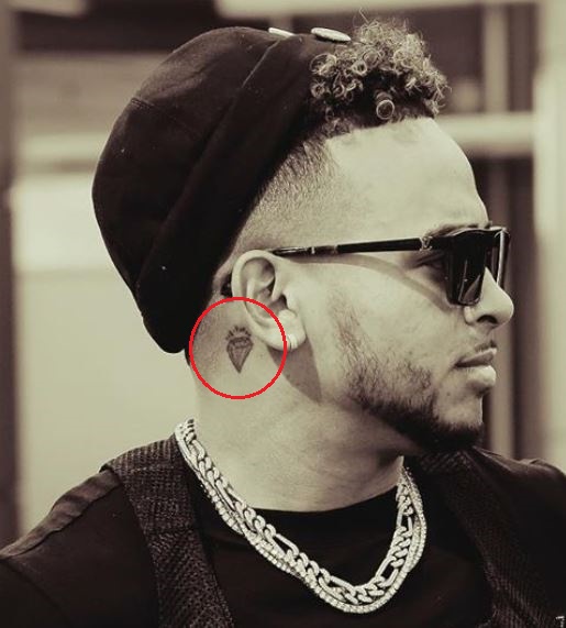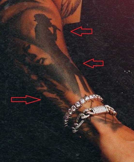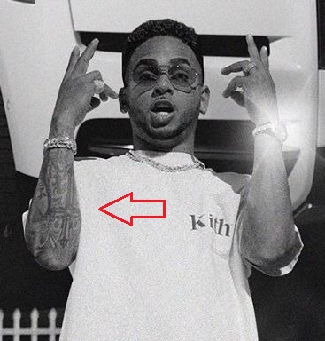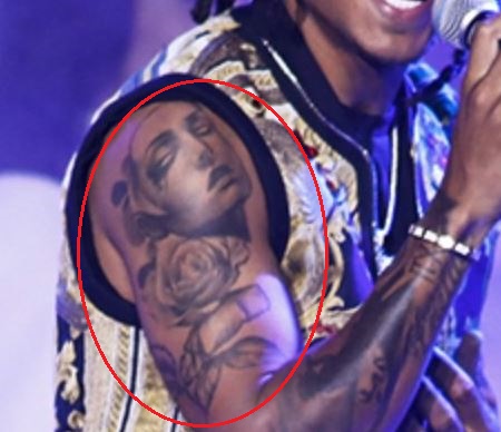 Tatuaggio: La spalla destra del cantante contiene un tatuaggio del volto di una donna. Sotto il viso della donna c’è un tatuaggio di due fiori di rosa con il gambo e le foglie che arrivano verso il basso e verso la parte posteriore del braccio.