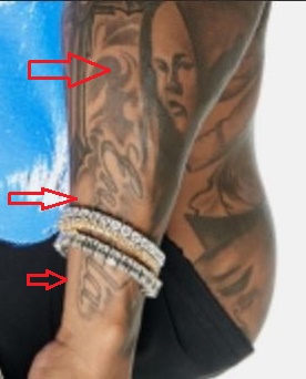Tatuaggio: La parte superiore del suo avambraccio destro contiene un tatuaggio di una sagoma di un uomo, che indossa un cappello e tiene un microfono in mano e canta. La parte inferiore del suo braccio contiene il volto di una donna anziana tatuata su di esso. Il lato del suo avambraccio destro contiene il nome, “Eneida” tatuato su di esso.