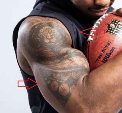 Tatuaggio: La spalla destra del giocatore contiene un tatuaggio della faccia di un leone all’interno di uno schema circolare. Il motivo circolare si unisce a un tatuaggio tribale di ispirazione samoana che copre il braccio destro e il bicipite destro.
