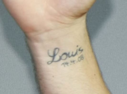 Tatuaggio: Il lato interno del polso destro del giocatore contiene il nome, “Louis” tatuato su di esso insieme alla data, “14.4.08” sotto di esso.