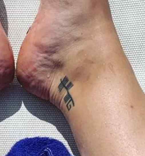 Tatuiruotė: Jos dešinės kojos viduje yra tatuiruotas dizainas, sudarytas iš skirtingų linijų.
