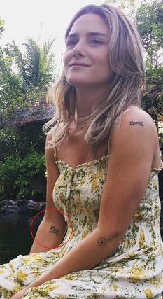 Tatuiruotė: Jos kairiojo riešo viršaus išorėje yra rašto simbolis.