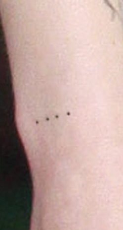Tatuiruotė: Dešiniojo riešo gale yra 4 taškų tatuiruotė