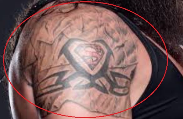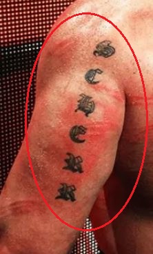 Tatuiruotė: Ant kairiojo imtynininko bicepso yra ištatuiruotas dizainas, kurio viduje tatuiruoti žodžiai „ŠALIS TIPUS“.