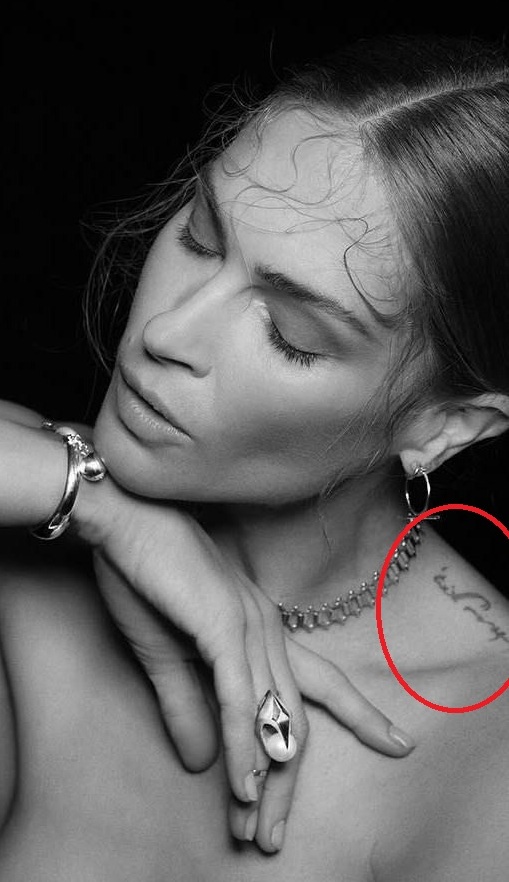 Reikšmė: Erin rašė rašalu ant kairiojo apykaklės kaulo. Iš pirmo žvilgsnio tai atrodo kaip arabiškas raštas. Tačiau modelis niekada neatskleidė tikrosios šios tatuiruotės prasmės.