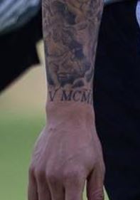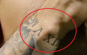 Tatuiruotė: Romėniški skaitmenys „XIX V MCM ..“ ištatuiruoti aplink dešinįjį riešą. Jo nuotraukose neatskleista visa data.