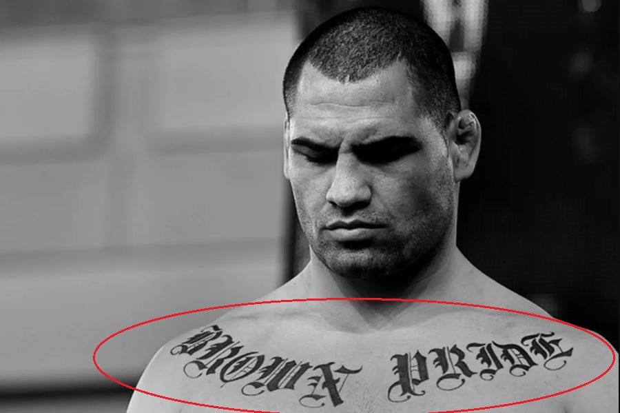 Tatuiruotė: Buvusios MMA skrynios paryškintu, menišku šriftu ištatuiruoti žodžiai „BROWN PRIDE“.