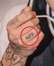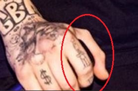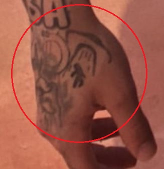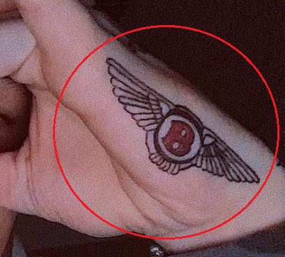 Tatuiruotė: Kairės rankos delno šone yra raidė „B“ raudonu rašalu, tatuiruotė apskritimo viduje kartu su sparnais iš abiejų pusių.