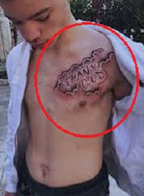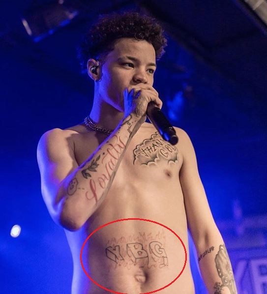 Tatuiruotė: Jo skrandžio viduryje yra raidžių tatuiruotė, ant jos tatuiruotė „YBG“, apsupta raudonos linijos, suteikiančios liepsnos efektą.