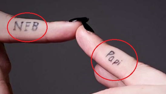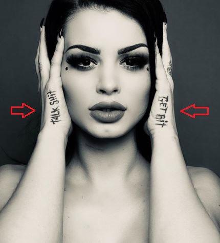 Tatuiruotė: Jos kairiojo vidurinio piršto šone yra raidės „NFB“. Jos dešinėje pusėje yra tatuiruotas žodis „Papi“.