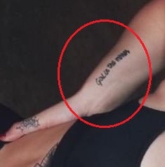 Tatuiruotė: Ant dešinės apykaklės kaulo taip pat ištatuiruoti keli žodžiai.