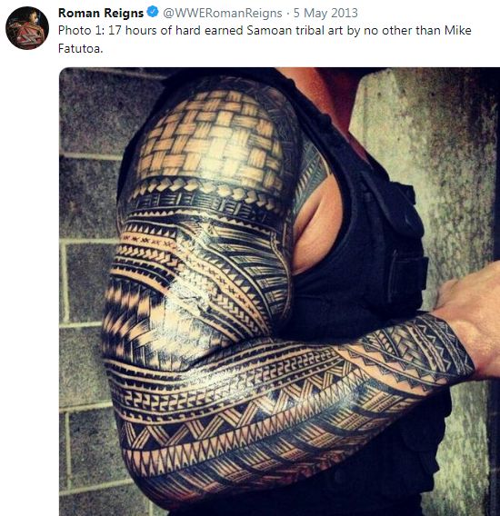 Pomen: Roman Reigns ima najboljšo tetovažo med vsemi prvaki WWE. Na desni rami si je natisnil tetovažo “Samoan Tribal Art”, ki se nadaljuje do desne roke in prsnega koša. To čudovito edinstveno umetnost je napisal Mike Fatutoa, ki je za dokončanje potreboval 17 ur. Roman je v najstniških letih to umetnost pravkar narisal na desno ramo, nato pa si je leta 2013 naredil tetovažo s polnimi rokavi Mikea Fatutoe. 5. maja 2013 je Roman na svoj visokotonski račun naložil sliko z napisom,