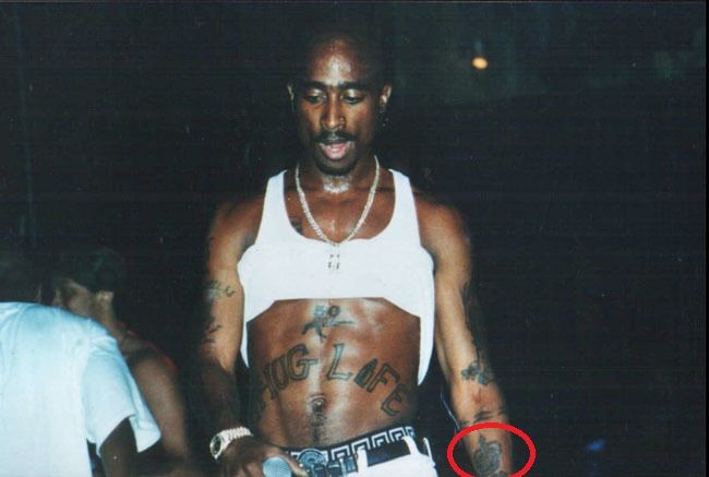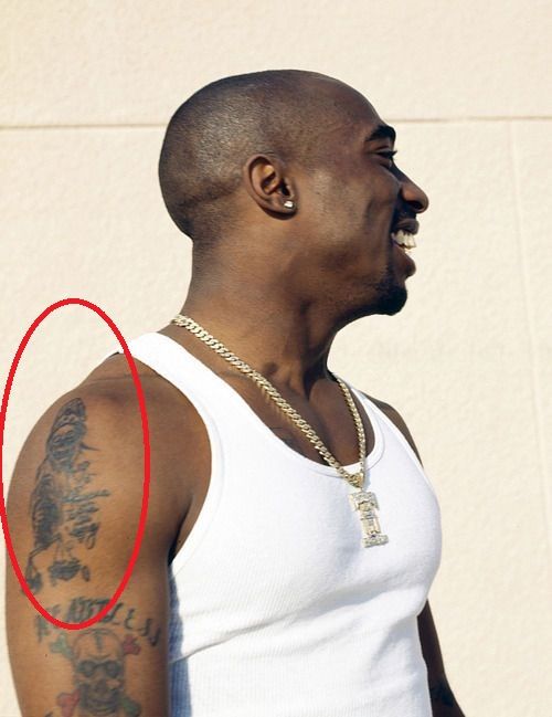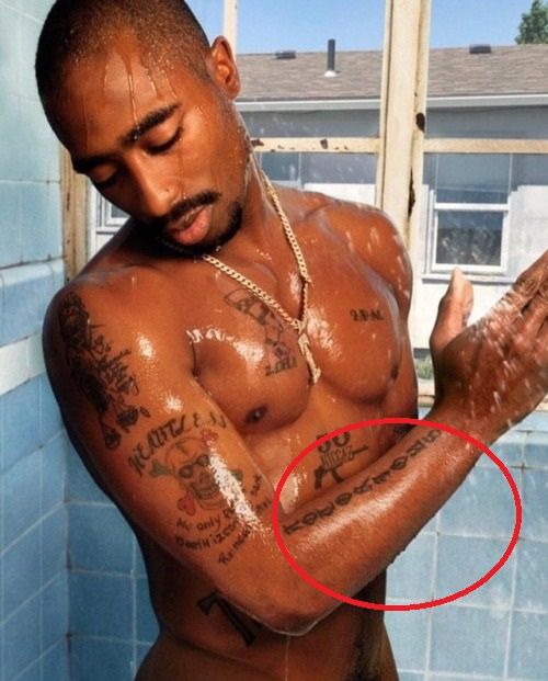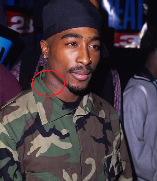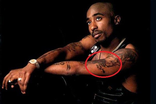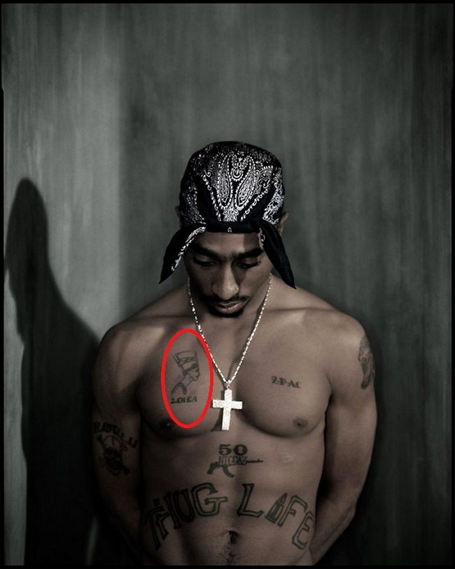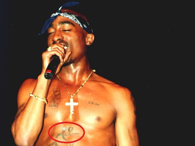 Pomen: Tupac Shakur je bil star komaj 18 let, ko si je na levi strani prsnega koša naredil prvo tetovažo “2PAC”. 2PAC je bilo umetniško ime Tupaca Shakurja. Tupac je kot hip hop umetnik pridobil veliko popularnost s svojimi scenskimi imeni 2PAC in Makaveli. Zato je na levi strani prsnega koša narisal svoje umetniško ime 2PAC.