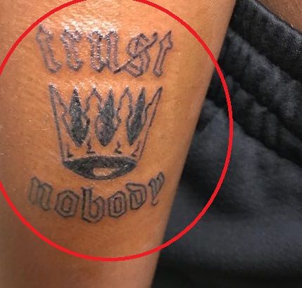 Tetovaža: Tetovaža “TRUST NOBODY” na notranjem delu desne podlakti.