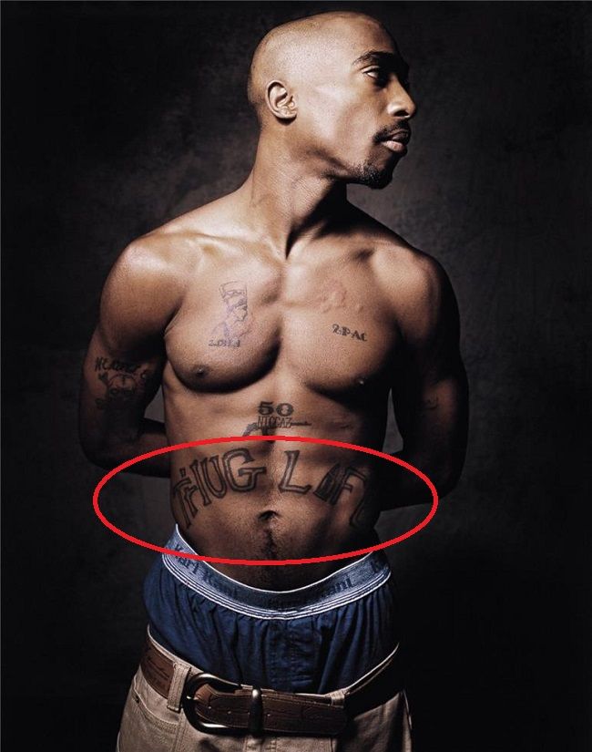 Pomen: Tupac Shakur si je na trebuhu narisal tetovažo “Thug Life”, pri čemer je “I” zamenjala krogla, ki je pridobila veliko popularnost. Ta tetovaža Tupac ima za seboj skrit pomen. Po njegovem mnenju je tetovaža Thug Life kratica za “Sovraštvo, ki ga daš malim dojenčkom, vse zajebava” kar pomeni, da se bo cikel, če bomo še naprej vzgajali otroke v negativnem, depresivnem okolju, obkroženem z rasizmom, nasiljem in zatiranjem, nadaljeval.