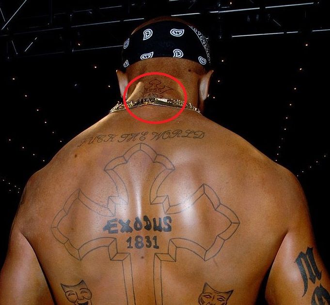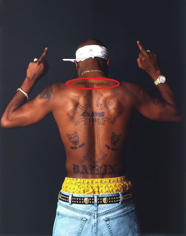Pomen: Tupac si je tetoviral FUCK THE WORLD tik pod vratom. Ta tetovaža je trinajsta skladba na njegovem tretjem albumu, Jaz proti svetu (1995). Tupacovo življenje je bilo polno vzponov in padcev, zato si je na hrbtu narisal tetovažo FUCK THE WORLD, da bi izrazil jezo do vseh.