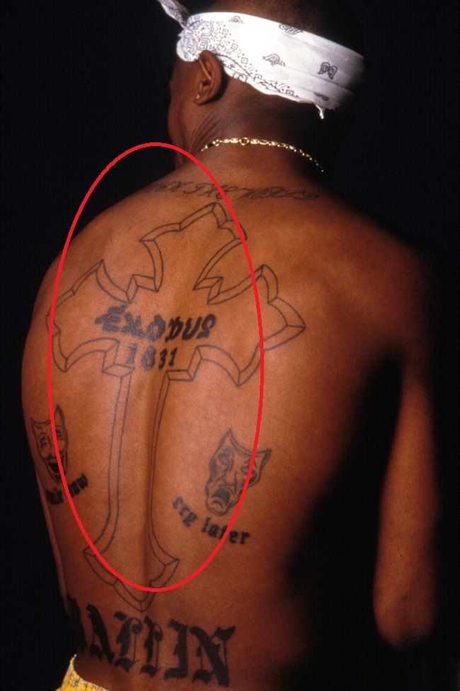 Pomen: Ta tetovaža Tupac ima za seboj veliko različnih pomenov. Križ ima veliko pomenov, kot so pravičnost, bog, vera in boj za človekove pravice. Tupacov umetnik tetoviranja Dennis “Dago” Coelho je v nekem intervjuju povedal, da si Tupac želi na hrbtu narisati tetovažo, ki bi jo lahko nosil s seboj do konca življenja. Nazadnje se je odločil za gotski križ z besedami EXODUS 1831 na hrbtu, ki je v javnosti znan kot križ Tupac.