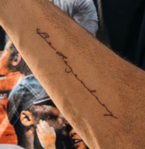 Tetovaža: Na notranji strani desne podlakti so tetovirane besede “Be Legendary”.