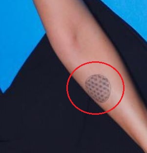 Tetovaža: Na notranji strani leve podlakti je krožna tetovaža z geometrijskimi oblikami.