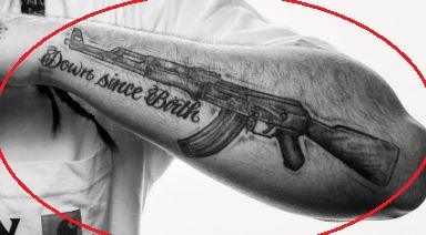 Tetovaža: Donja strana lijeve podlaktice sadržavala je tetovažu jurišne puške. Riječi “Dolje od rođenja” također su bile tetovirane sa strane lijevog zgloba.