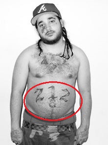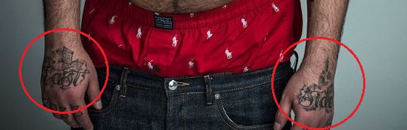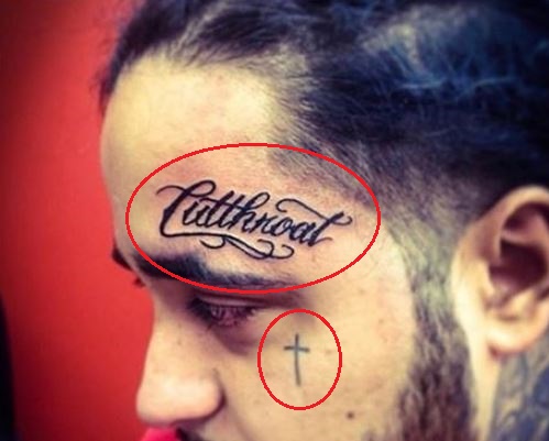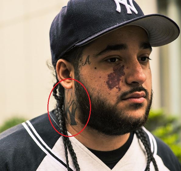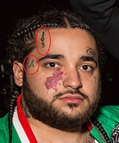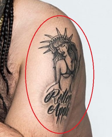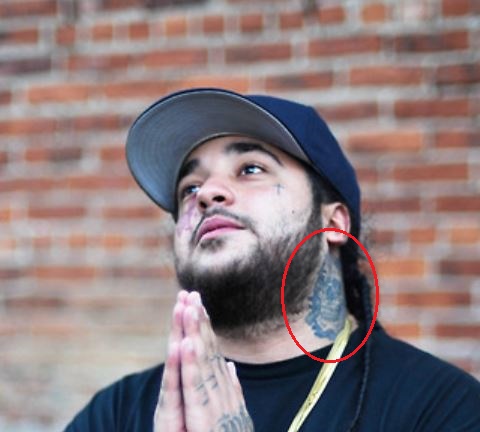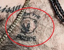 Tetovaža: Na lijevoj peći repera nalazila se tetovaža lica crtane svinje zajedno s riječima: “JEBI POLICIJU” tetoviranu oko nje.