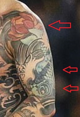 Tetovaža: U gornjem dijelu desne ruke i ramena nalazi se velika tetovaža cvijeta krizanteme. Ostatak tetovaža na nadlaktici spojen je vinovom lozom i cvijećem s kovitlatim linijama u pozadini koje pokrivaju prazna mjesta između.