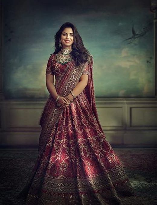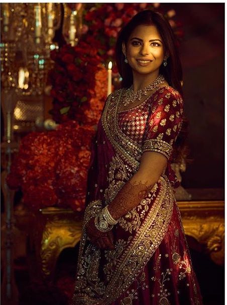 Isha Ambani pasirinko pasirinktinę aksominę lehengą, kuri sudaryta iš Salma-Sitara, sidabro ir tauriųjų metalų sąrašo. Raudona kaštoninė Sabyasachi lehenga išties pasakiškai atrodo su nuostabiu darbu, kuris buvo atliktas. Tinklas dupatta taip pat laikomas sunkus pasienyje ir puikiai papildo visą Sabyasachi lehenga.