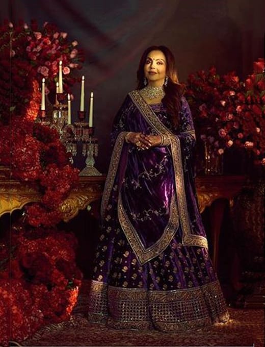 Nita Ambani lehenga aprangą specialiai suplanavo Sabyasachi Mukherjee su pasirinktiniu zardozi aksomo aksesuaru su sidabro, dabkos ir tauriųjų metalų serija. Ši violetinė Sabyasachi lehenga tikrai pranoksta savo dizainą, nes tai daroma naudojant auksinį darbą, kuris atrodo tikrai nuostabiai. Auksinis darbas violetiniame fone tai tikrai parodo.