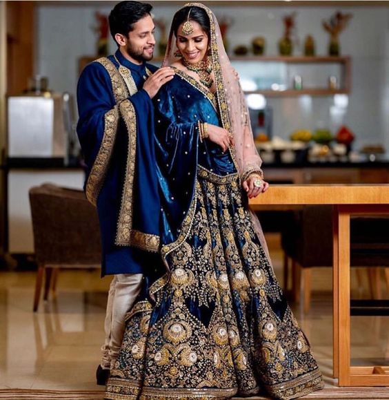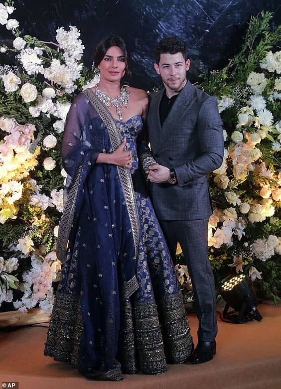 Priyanka Chopra vestuvėms Mumbajuje dėvi brokatinį korsetą su atitinkančia tamsiai mėlyna lehenga. „Sabyasachi lehenga“ yra tamsiai mėlynos spalvos, ant kurios auksiniai siuvinėjimai atrodo tikrai gražiai. Tai tikrai išryškina Sabyasachi lehenga siuvinėjimus ir papildo visą išvaizdą.