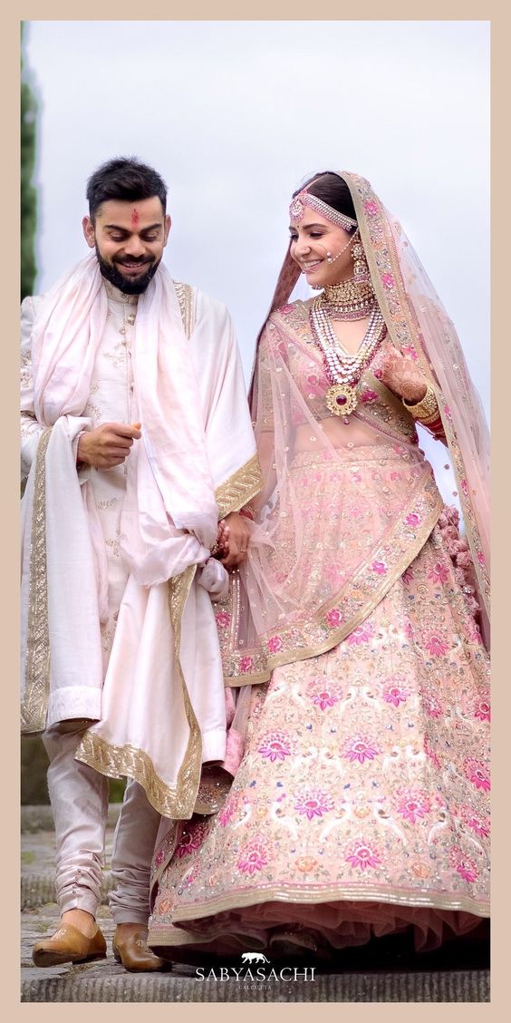 Anushka Sharma vestuvių lehenga yra specialiai sukurta Sabyasachi su pasteliniu atspalviu, gėlių motyvais ir zardozi kūriniais, kuriuos papildo neapdorotas deimantinis skustuvas. Tamsiai rožinis gėlių siuvinėjimas atrodo tikrai gražiai, o tai yra puikus dalykas, kuris čia buvo padarytas.