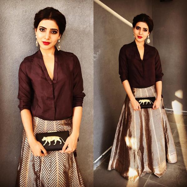 Samantha visada pasirodo esanti „Sabyasachi“ mergina, nes dažnai ją galima pamatyti vilkintį daugybę „Sabyasachi“ suknelių, nesvarbu, ar tai skirta tik vestuvėms, ar atsitiktiniams drabužiams. Ši apranga yra moderni ir kasdieniška „Sabyasachi Lehenga“, kurią galima dėvėti ir dienos metu. Jis nėra per sunkus ir atrodo tikrai gražiai su gražiu chokaru, nes šio „Sabyasachi Lehenga“ blizgis yra kaip marškiniai. Galima nesunkiai pasakyti, kad tai labiau modernistinis tradicijos posūkis. Rudos ir auksinės spalvos labai tinka prie šio dizaino.